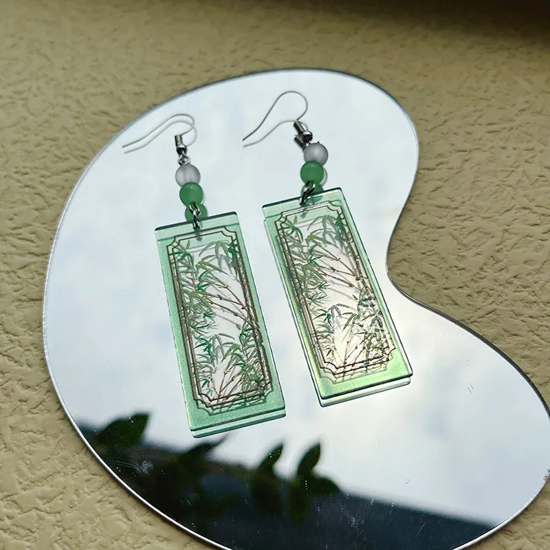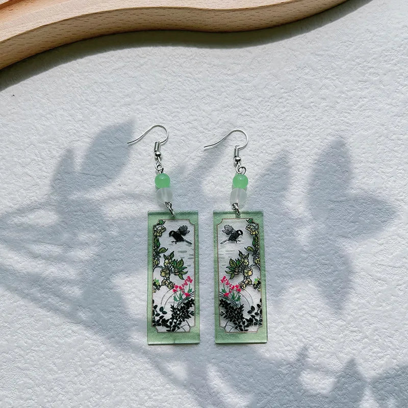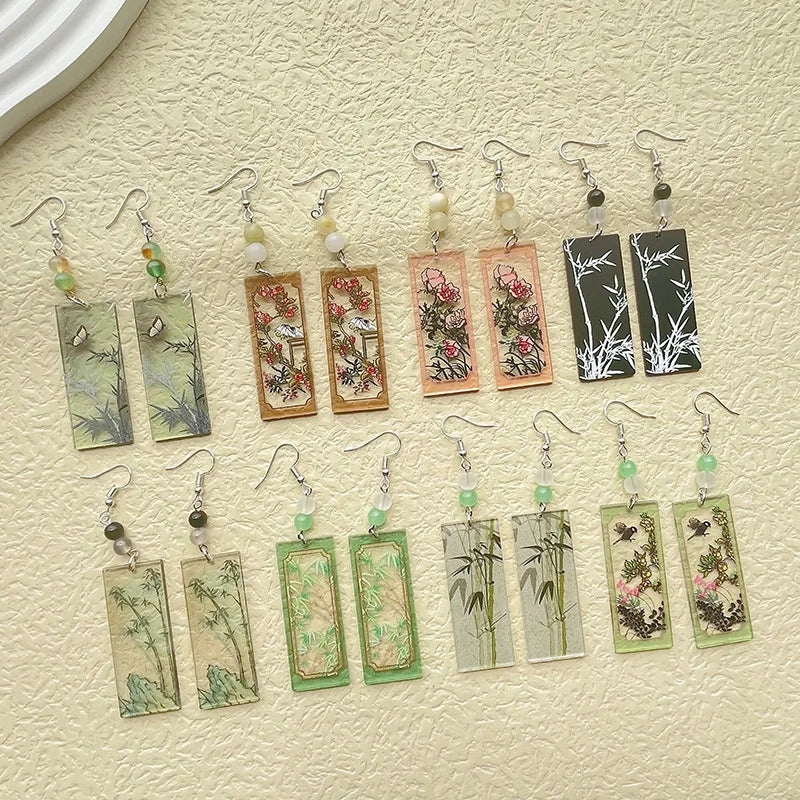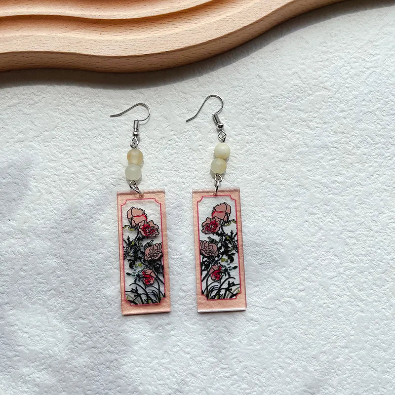 2025 New Chinese Ancient Style Ink Painting Peony Flower Acrylic Dangle Earrings for Women Vintage Ethnic Square Drop Earring