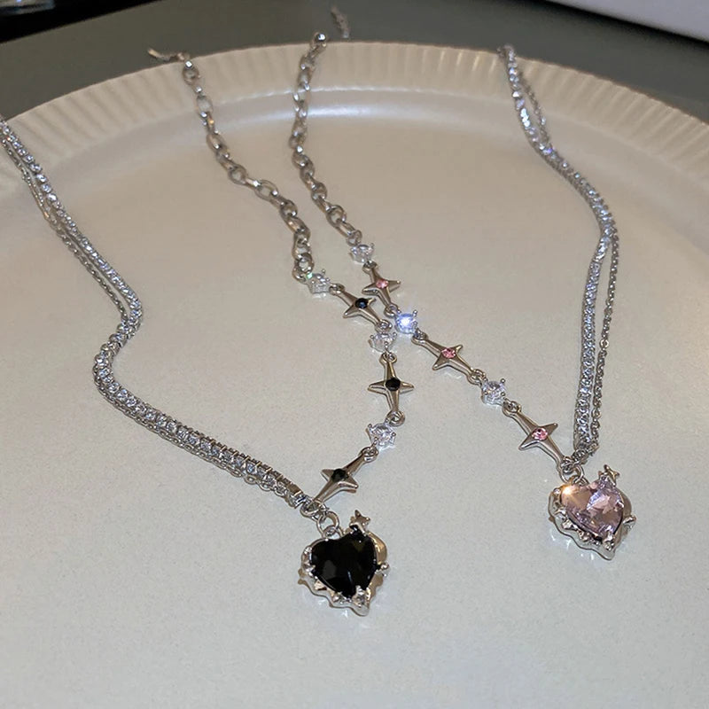 Kpop Black Heart Pendant Necklace Punk Shiny Rhinestone Star Asymmetric Chain Necklace for Women Neck Chain Y2K Jewelry