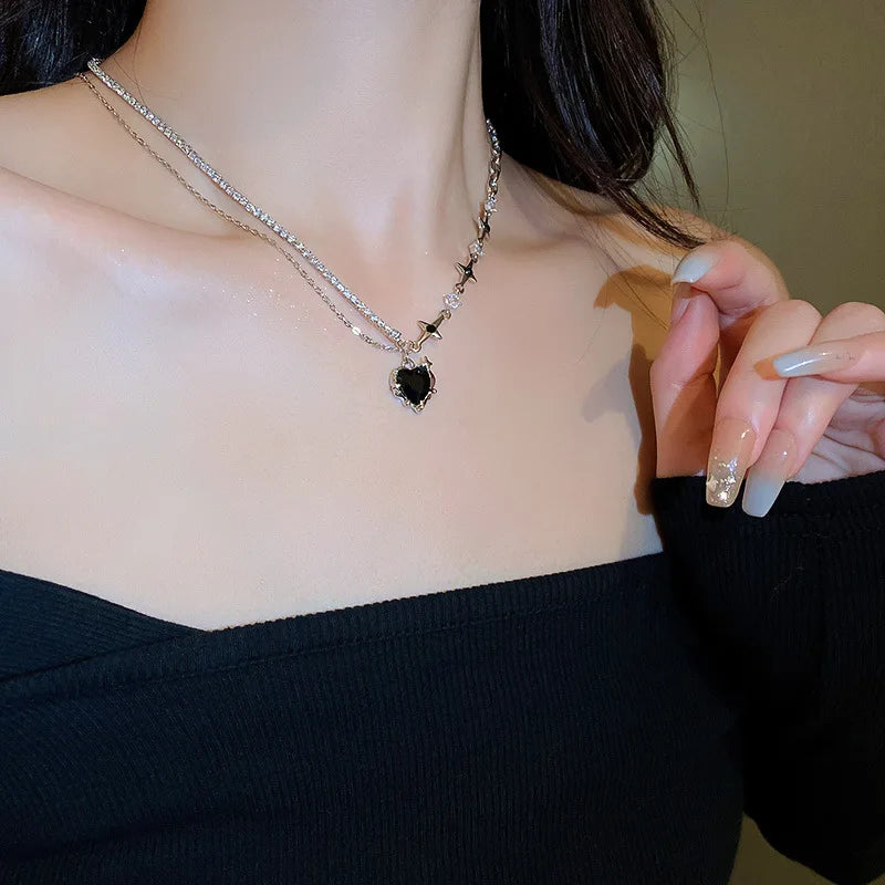 plus Kpop Black Heart Pendant Necklace Punk Shiny Rhinestone Star Asymmetric Chain Necklace for Women Neck Chain Y2K Jewelry