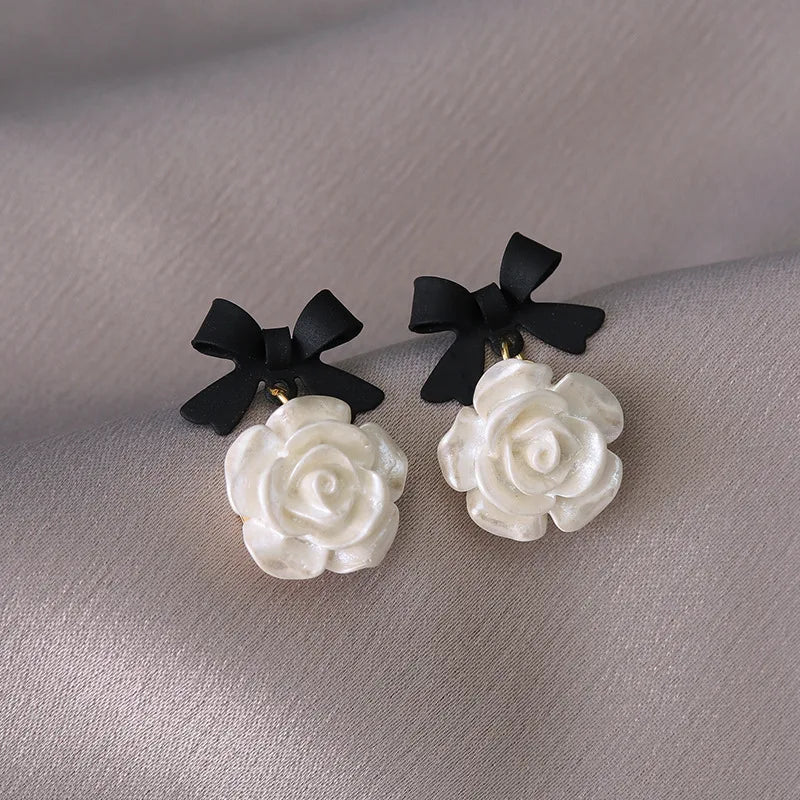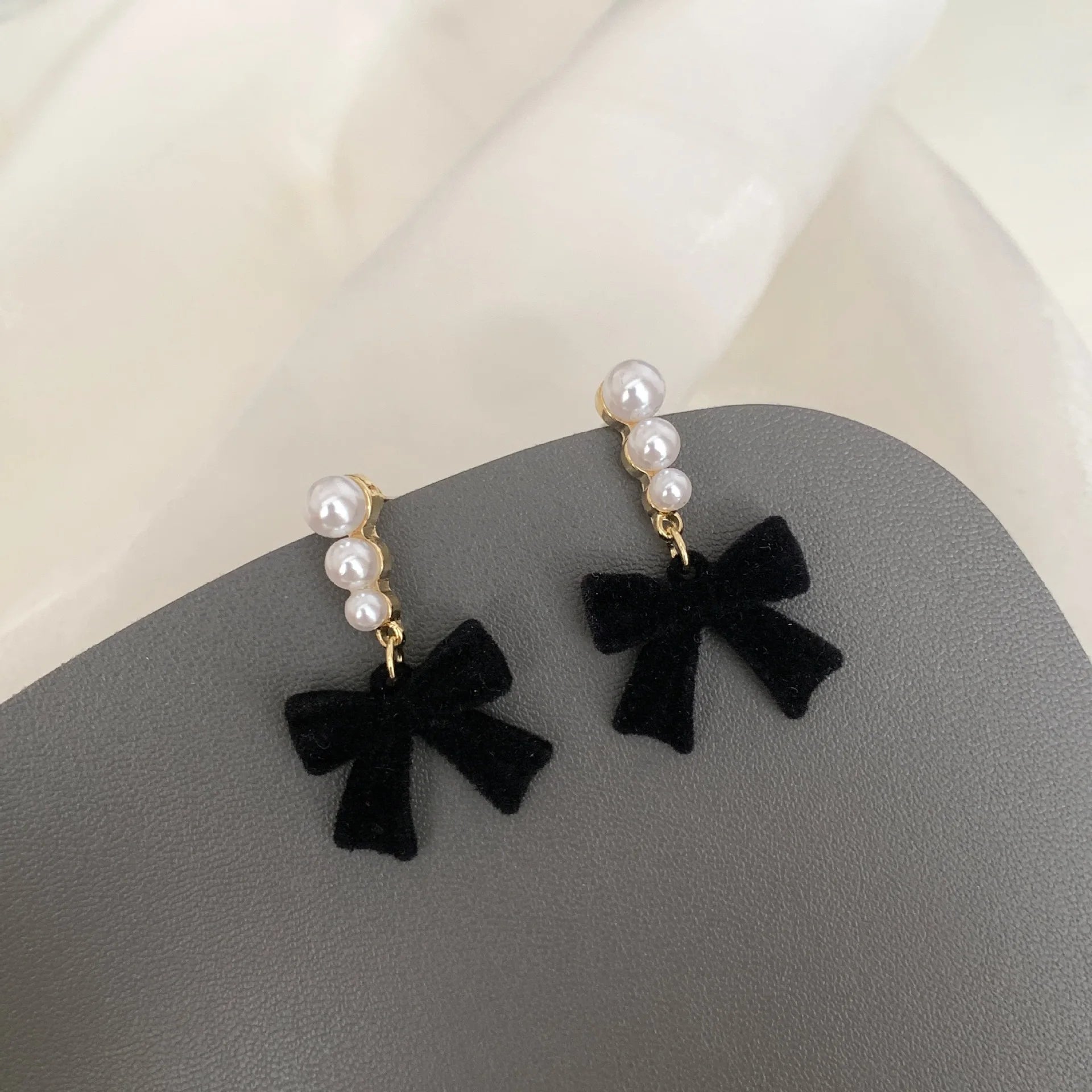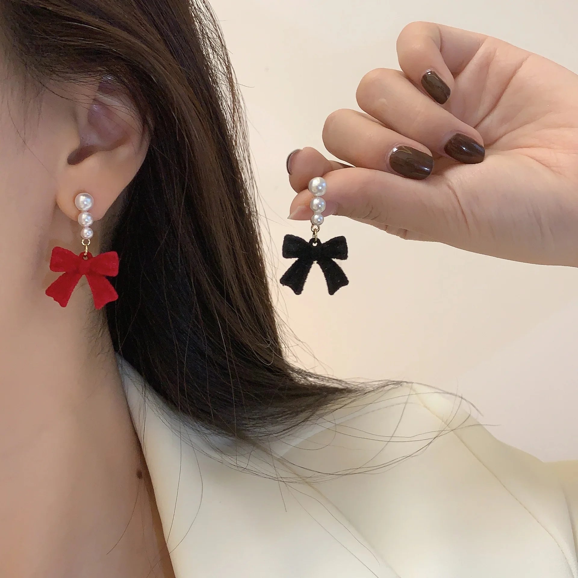 Sweet Black Red Velvet Bow-knot Pearl Drop Earrings for Women Elegant Korean Fashion Wedding Dangle Earring Gift
