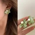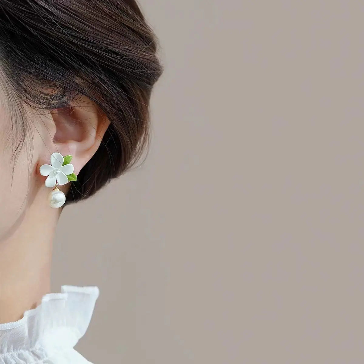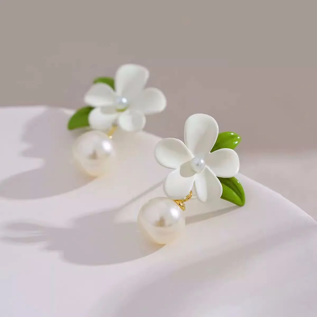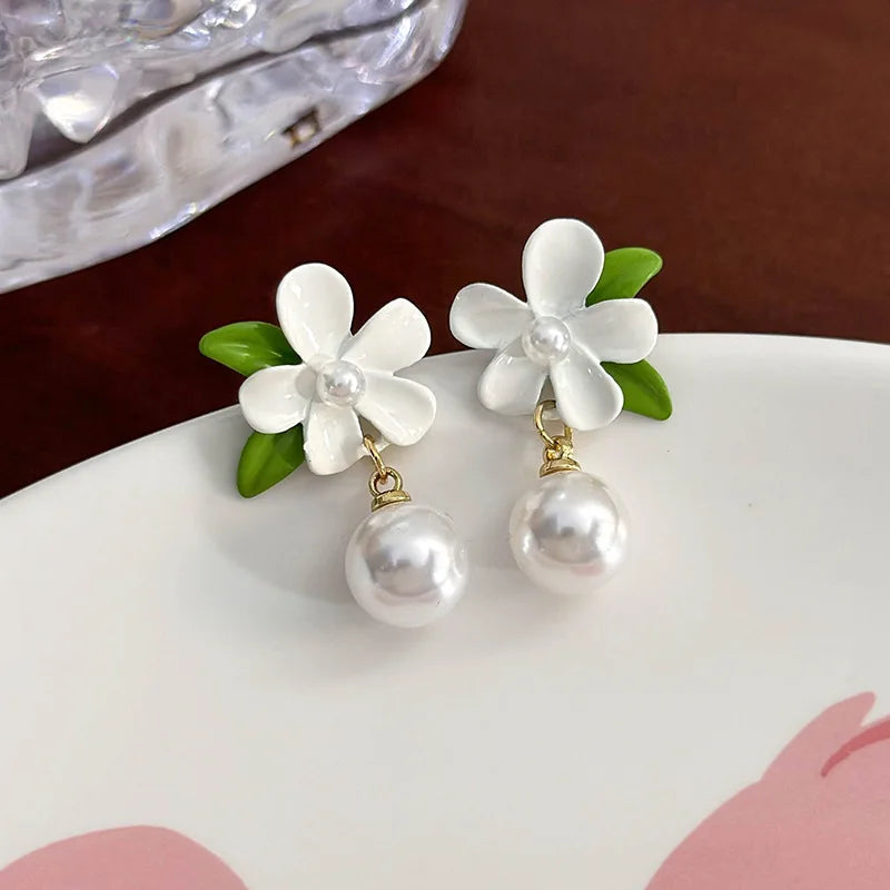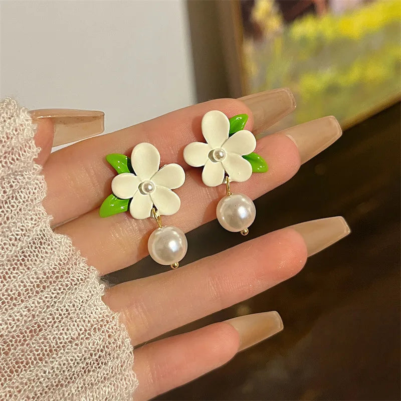 Sweet White Gardenia Flower Pearl Dangle Earrings for Women Green Leaf Korean Fashion INS Floral Earring Gift